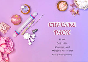 Holen Sie sich ein Starterset, wenn Sie zum Backkurs kommen, oder kaufen Sie eines, um es zu Hause auszuprobieren. Darin enthalten sind der Zuckerstreusel, die Spritztülle, der Pinsel, der Margerite Ausstecher, das Kunststoff Nudelholz.